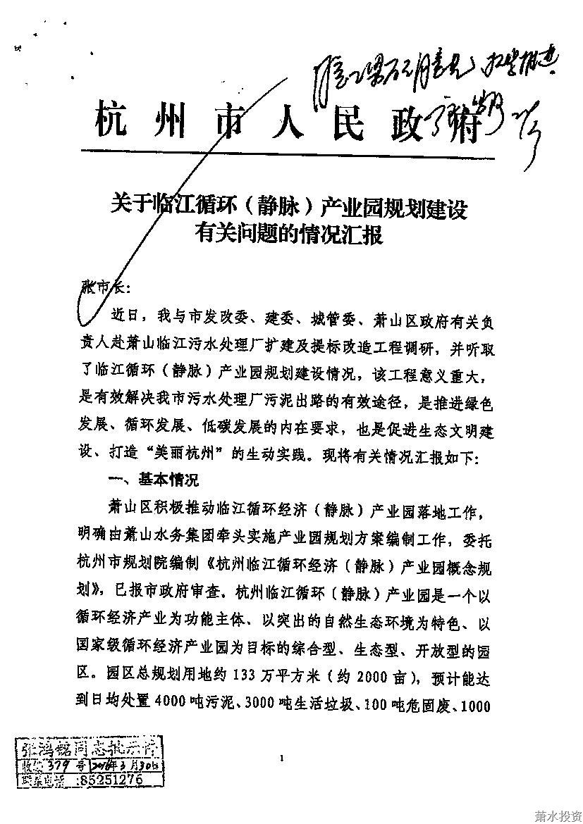 张市长指挥件中对临江循环经济(静脉)工业园项目作了高度评价,,, ,, ,,,以为该项目意义重大,,, ,, ,,,是解决我市污水处置惩罚厂污泥出路的有用途径,,, ,, ,,,是推进绿色、循环、低碳生长的内在要求,,, ,, ,,,也是增进生态文明建设、打造“漂亮杭州”的生动实践。 。。。。。由于工业园涉及萧山区和大江东工业集聚区,,, ,, ,,,权属管理问题重大,,, ,, ,,,张市长赞成高照料的意见,,, ,, ,,,催促市妄想局尽快组织计划审查并做好后续控规体例指导事情,,, ,, ,,,要求市城投集团等相关部分提前介入,,, ,, ,,,增强与工业园的周全战略合作,,, ,, ,,,一揽子解决杭州市污水厂污泥、垃圾、飞灰、有毒有害固废协同处置惩罚问题。 。。。。。