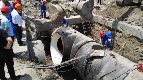 二、施工投入力度大。。。。。。。对DN2400管阀门举行了立异刷新,,,,,,使原本3个半小时的关阀时间缩短至1个半小时。。。。。。。8台排水泵,,,,,,50余人30小时不中止作业,,,,,,与时间赛跑。。。。。。。