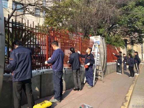 自愿服务美情形。。。。。团结“不忘初心 切记使命”主题教育党员自愿服务要求,,, , ,,,萧水物业党支部组织全体党员、入党起劲份子、团员青年主干一起下手对水务大厦南门护栏举行刷漆,,, , ,,,配合点亮大厦情形。。。。。