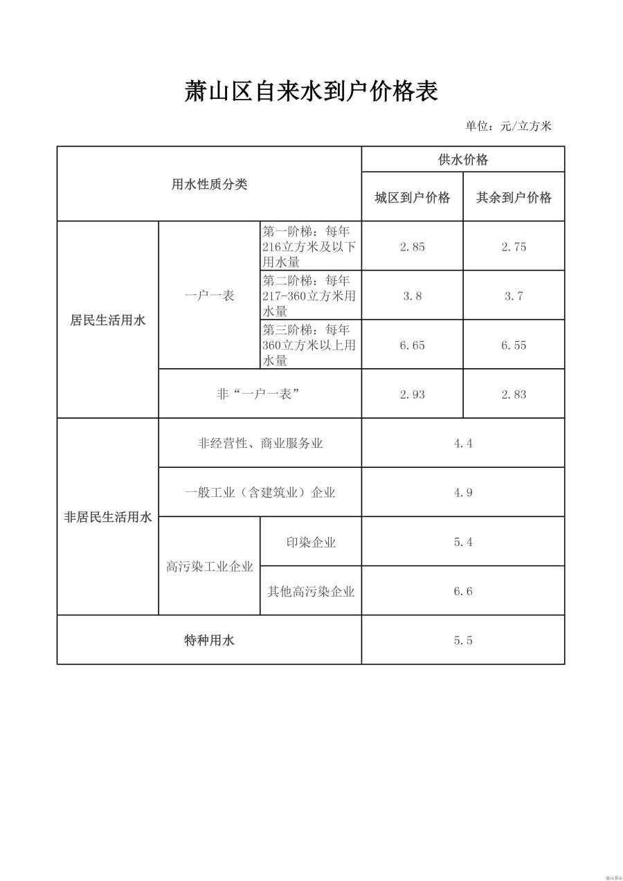 非住民生涯用水:供水价钱凭证萧价【2016】46号文件自2017年1月1日用水时间起执行;;;;;;;;污水处置惩罚价凭证萧价【2014】46号文件自2014年8月1日排水时间起执行。。。。。。。。