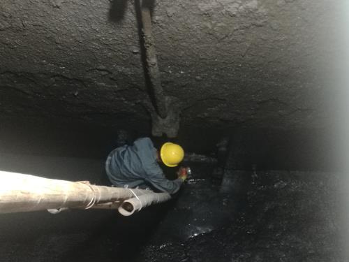 为确保施工清静,,,,,,,事情职员先行检测污水池内情形清静,,,,,,,作业职员方佩带有毒气体检测仪下井作业。。。。。装置历程中,,,,,,,前期排水事情遇到进水阀门无法完全闭合,,,,,,,导致蓄水池内的污水无法排空的难题。。。。。经事情职员群策群力,,,,,,,重复讨论协商,,,,,,,决议暂时接纳水泥堵住阀门与墙体之间误差的要领对蓄水池内的污水举行排空。。。。。
