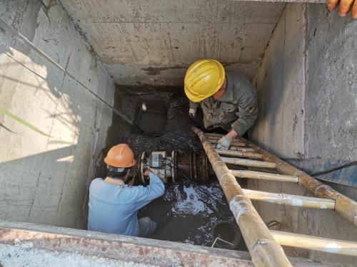 此前,,,,,,进化机电园区泵站原出水流量计因传感器进水损坏,,,,,,计量爆发误差,,,,,,替换刻禁止缓。。。。。。。由于闭水阀门靠近进化镇级泵站处,,,,,,与进化机电园区泵站距离较远,,,,,,在替换装置施工历程中需用排污泵排空污水管内一直回流的污水,,,,,,增添了施工难度。。。。。。。