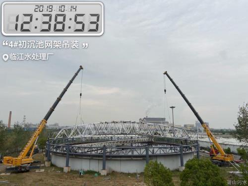 10月14日中午,,,,,随着初沉池60 m直径大型网架装置完工,,,,,临江水处置惩罚厂加盖除臭项目已完成70 %。。。。。