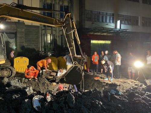 由于新开河泵站位于河浜路上,,,,,,,,过往行人多,,,,,,,,车流量大,,,,,,,,管线重大,,,,,,,,开挖空间有限,,,,,,,,大型机械无法操作,,,,,,,,只能接纳人工和小挖机作业,,,,,,,,大大加深了漏水点探测难度,,,,,,,,直至下昼5时才确定漏水点位置举行抽水封堵。。。。。。。。经由7小时一直歇作业,,,,,,,,于7月1日0时30分顺遂完成抢修。。。。。。。。
