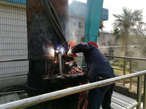 接电后,,,,,机修职员连忙前往党湾泵站,,,,,关闭4#水泵电源并起吊水泵举行检查,,,,,发明水泵冷却循环管道侵蚀破碎,,,,,须连忙替换。。。。。在制订维修计划并做好清静防护步伐后,,,,,机修职员对破碎的冷却循环管举行切割,,,,,重新量取质料尺寸并顺遂焊接。。。。。最后,,,,,受检水泵起吊装置归位,,,,,试运行检查“术后”情形,,,,,未发明漏水和污水翻涌征象。。。。。